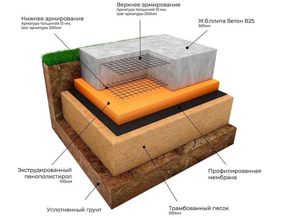 Устройство основной плиты фундамента Общая площадь 100 м2, толщина 300 мм. | |||||